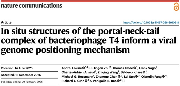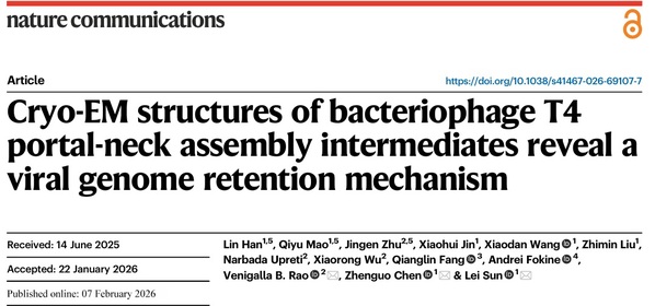 2026年2月20日, 复旦大学生物医学研究院孙蕾、上海市第五人民医院陈振国联合美国天主教大学Venigalla B. Rao在《自然-通讯》(Nature Communications)上背靠背发表了两篇题为“Cryo-EM structures of bacteriophage T4 portal-neck assembly intermediates reveal a viral genome retention mechanism”、“In situ structures of the portal-neck-tail complex of bacteriophage T4 inform a viral genome positioning mechanism”的研究论文。研究首次揭示了噬菌体T4颈部结构的组装及动态变化,阐明了其在高压下封存与定位头部基因组的机制。