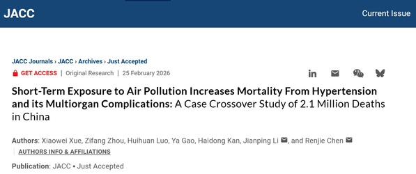 2026年2月25日,复旦大学公共卫生学院陈仁杰团队联合北京大学第一医院心内科李建平团队,在《美国心脏病学会杂志》(Journal of the American College of Cardiology)上发表了题为“Short-Term Exposure to Air Pollution Increases Mortality From Hypertension and its Multiorgan Complications: A Case Crossover Study of 2.1 Million Deaths in China”的研究论文。该研究基于我国210多万高血压相关死亡的个体水平数据,从流行病学层面系统揭示了空气污染暴露对高血压不同进展阶段(从原发性高血压到多器官衰竭)死亡的阶梯式放大趋势,为高血压人群的风险分层与精准环境干预提供了科学证据。
