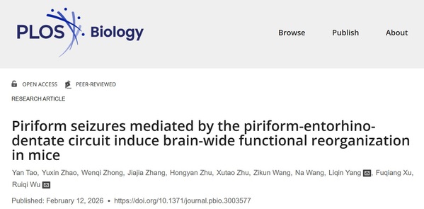 2026年2月12日,复旦大学脑科学研究院/脑功能与脑疾病全国重点实验室吴瑞琪团队在PLOS Biology发表题为“Piriform seizures mediated by the piriform-entorhino-dentate circuit induce brain-wide functional reorganization in mice”的研究论文。吴瑞琪团队建立了以磁共振成像(MRI)为枢纽的多模态融合研究范式,首次阐明了梨状皮层→外侧内嗅皮层→齿状回这一核心通路在驱动癫痫发作及全脑功能重组中的关键作用。本研究为基于脑网络机制来提升癫痫治疗方案提供了理论基础和新思路。