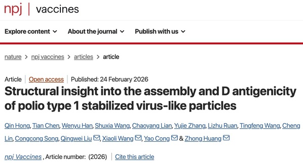2026年2月24日,上海市重大传染病和生物安全研究院黄忠团队、中国科学院分子细胞科学卓越创新中心丛尧团队和华淞(上海)生物科技有限公司王晓黎、刘庆伟团队合作,在NPJ Vaccines发表题为“Structural insight into the assembly and D antigenicity of polio type 1 stabilized virus-like particles”的研究论文。该研究系统报道了利用酵母重组表达系统高效制备PV1的热稳定型病毒样颗粒(Virus-Like Particle,VLP)作为候选疫苗,并通过冷冻电镜系统解析了其组装机制及D-抗原性的结构基础,有助于加快新一代脊灰疫苗的开发,有望为“全球小儿麻痹症根除计划”提供更加安全、高效、可规模化的解决方案。