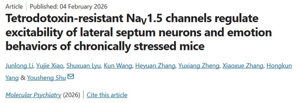 2026年2月4日,复旦大学脑科学转化研究院舒友生团队在《分子精神病学》(Molecular Psychiatry)上发表了题为”“河豚毒素耐药性NaV1.5通道调节外侧隔神经元的兴奋性和慢性压力小鼠的情绪行为(Tetrodotoxin-resistant NaV1.5 channels regulate excitability of lateral septum neurons and emotion behaviors of chronically stressed mice)”的研究论文。该研究发现,通常被认为主要在心脏表达的NaV1.5,在外侧隔核(Lateral septum, LS)神经元中高丰度表达,并在调控神经元兴奋性和负性情绪中发挥重要作用。