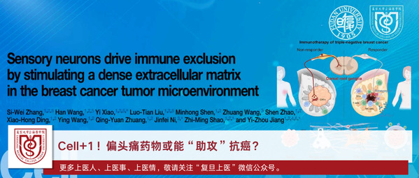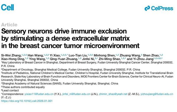 2026年2月6日,复旦大学附属肿瘤医院邵志敏、江一舟团队,联合复旦大学脑科学转化研究院倪金飞团队,在《细胞》(Cell)在线发表题为“感觉神经元通过刺激乳腺癌肿瘤微环境中的致密细胞外基质来驱动免疫排斥(Sensory neurons drive immune exclusion by stimulating a dense extracellular matrix in the breast cancer tumor microenvironment)”的研究论文。该研究首次揭示肿瘤中的感觉神经是导致部分三阴性乳腺癌患者免疫治疗在短期内耐药的“元凶”。基于动物模型实验,研究团队发现治疗偏头痛的药物可用于增敏免疫治疗,为破解三阴性乳腺癌患者免疫治疗耐药提供了“中国方案”。