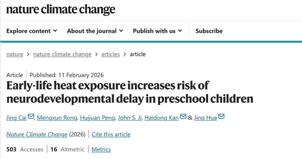 2026年2月11日,复旦大学公共卫生学院蔡婧、阚海东团队联合同济大学附属第一妇婴保健院花静团队,在《自然-气候变化》(Nature Climate Change)发表题为“Early-life heat exposure increases risk of neurodevelopmental delay in preschool children”的研究论文。研究基于全国学龄前儿童队列开展,研究区域涵盖了较为广泛的地理和气候类型,揭示了从胎儿期到幼儿期的高温及热浪暴露对学龄前儿童神经发育的影响。同时,研究提示在全球气候持续变暖的背景下,亟需将保障儿童健康纳入气候适应性规划中。