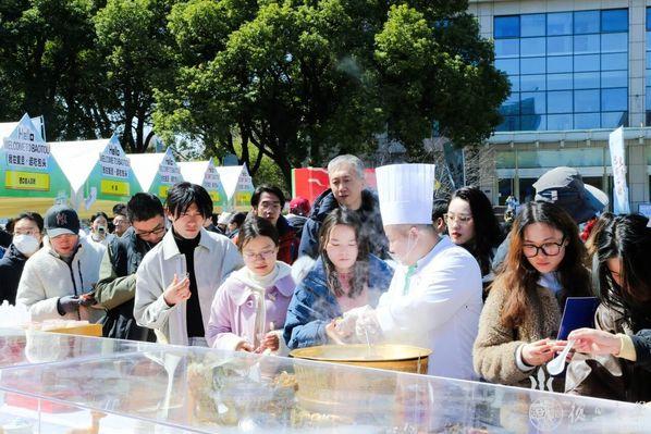 尤为吸引人的是包头带来的特色美食。大家排着长队在“阴山食脉”摊位前等待着品尝美食。当头顶着红花的烤全羊推出后,一瞬间就成为了全场的焦点,师生们马上将其团团围住。