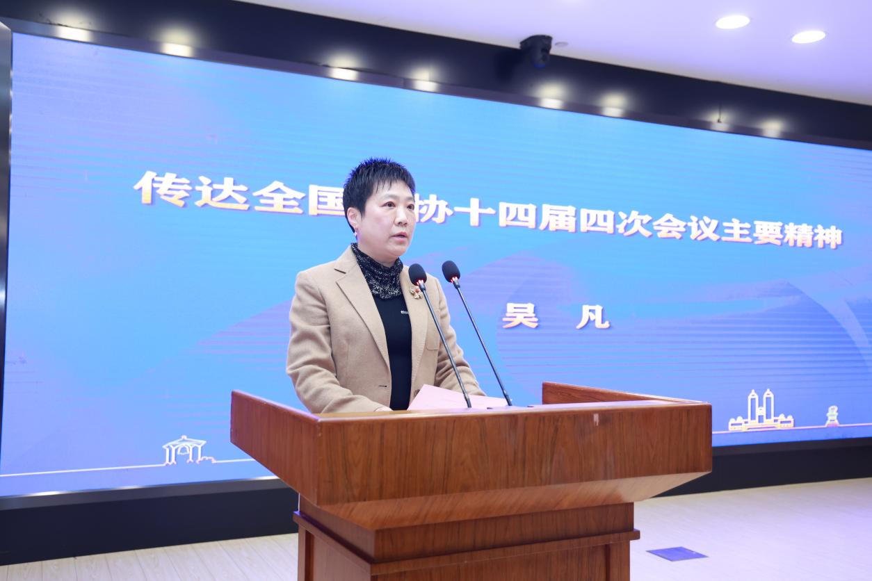 吴凡介绍全国政协十四届四次会议的基本情况,传达习近平总书记的重要讲话精神和全国政协主席王沪宁代表政协第十四届全国委员会常务委员会所作工作报告的主要精神,并分享个人履职情况和体会。