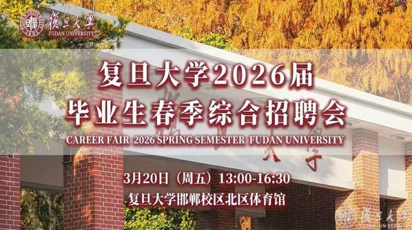 春风送暖,万物竞发。复旦大学2026届毕业生春季招聘会于3月20日(周五)13:00-16:30将在邯郸校区北区体育馆举行,欢迎各位同学踊跃参与,收获属于你的那份 offer。