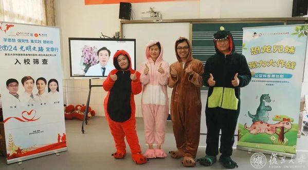 2024年,刘鎏(右一)为湖南省宜章县迎春镇碕石村承启红军小学学生演绎科普舞台剧《恐龙兄妹视力大作战》