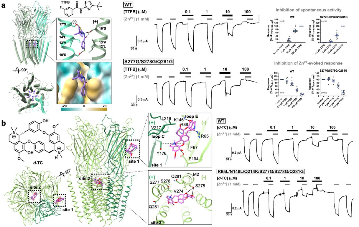 此外,研究还揭示了两种拮抗剂的抑制机制:选择性拮抗剂TTFB通过嵌入跨膜区直接阻塞离子通道;而非选择性拮抗剂d-筒箭毒碱则采用“双位点”结合模式,既竞争锌离子结合界面,也进入通道孔内部,从而高效抑制通道活性 (图2)。