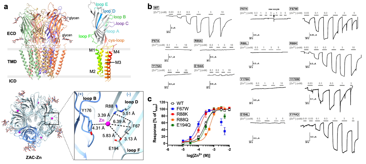 图1. 人源ZAC的ECD区域Zn2+-π互作网络分析。a,ZAC结合Zn2+的五聚体结构及ECD结合位点的细节展示。b,采用双电极电压钳记录技术,检测在表达野生型ZAC及突变体的非洲爪蟾卵母细胞中,Zn²⁺诱发电流响应结果。c,野生型及突变体F67W、R88K、E194Q ZAC的激动剂浓度-响应关系曲线。