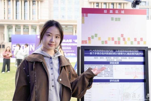 她和团队成员选择利用多模态临床数据建立统计模型,帮助医生预测原发性醛固酮增多症患者的心脑血管风险。“我们拿到的数据有七八十个自变量,但只有六十几个病例。如果直接回归,很容易过拟合,我们就选择主成分分析降维。”杨涵竹指着海报上的模型图解释。虽然所学专业与医学相去甚远,但通过一次次与临床医生线下开会、反复沟通,团队的模型也在不断调整优化。“现在我们发现,PET-CT里的某个影像特征与左心房重构有关系。医生拿到这个结果后,可以去做更深入的机制研究。”