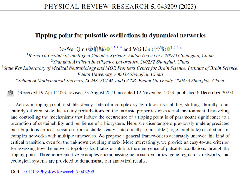 复旦大学智能复杂体系基础理论与关键技术实验室秦伯韡、林伟揭示动力学网络中脉冲振荡的涌现机理2023年12月6...