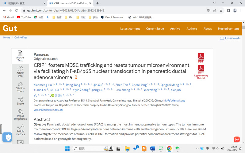 2023年8月4日,复旦大学附属肿瘤医院虞先濬/施思教授团队在国际权威学术期刊GUT上在线发表题为CRIP1 fosters...
