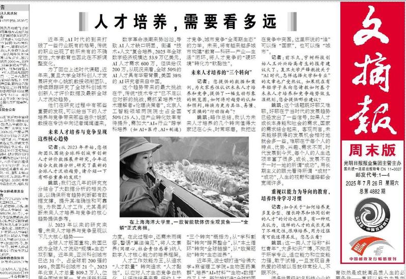 人才培养,需要看多远《 文摘报 》( 2025年07月26日 01 版)在上海海洋大学里,一款智能软体仿生观赏鱼——...