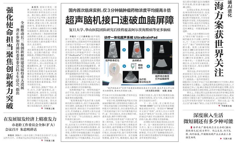 “超声脑机接口”应用于胶质母细胞瘤患者治疗示意图:通过声波打开大脑的血脑屏障,帮助化疗药物入脑。(研...